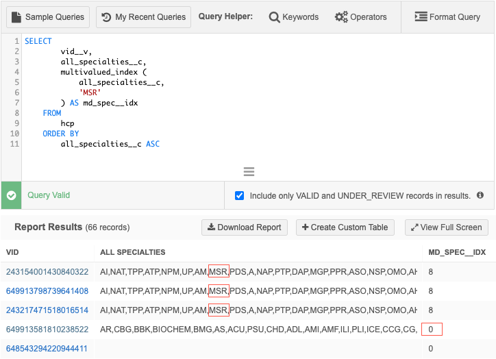In this example, the query returns the position of the MSR value for the all_specialties__c field for each record.