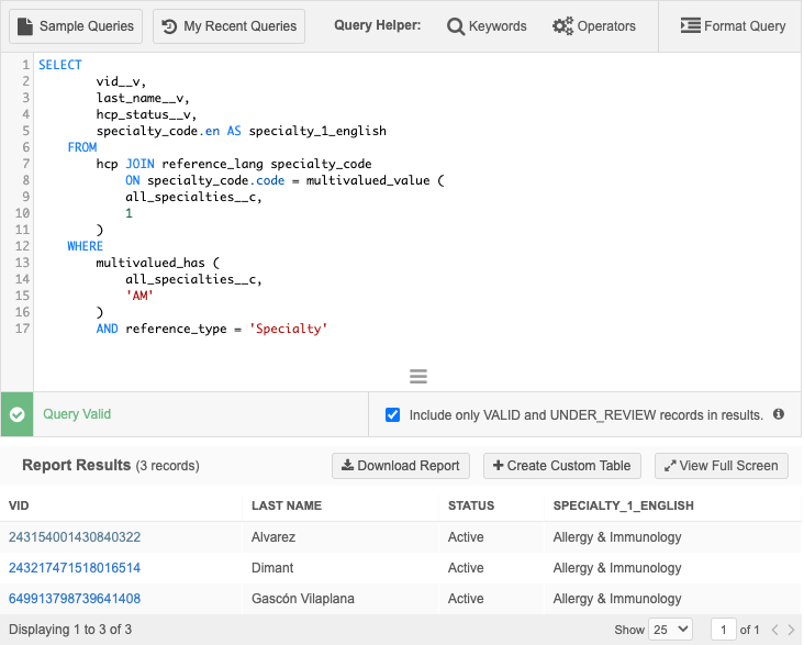 This query extracts the records that have the AM reference code as the first value on the all_specialties__c multivalued field. Then, it returns the English label for the AM code.