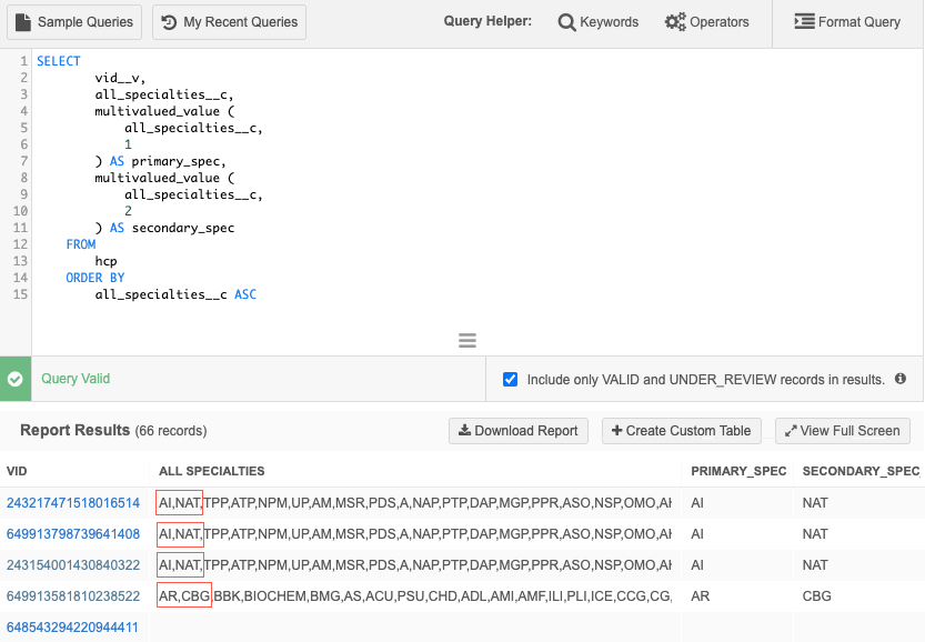 This query extracts the values in the first (1) and second (2) position from the all_specialties__c multivalued field.