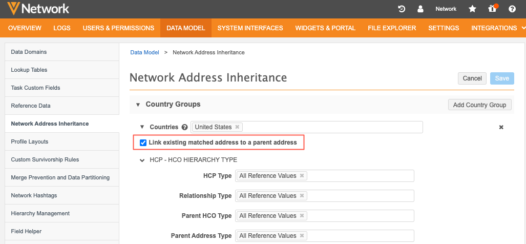 This option to link matching Parent HCO addresses to an existing address on the child HCP/HCO can be enabled for each country group defined in your Network Address Inheritance configuration.