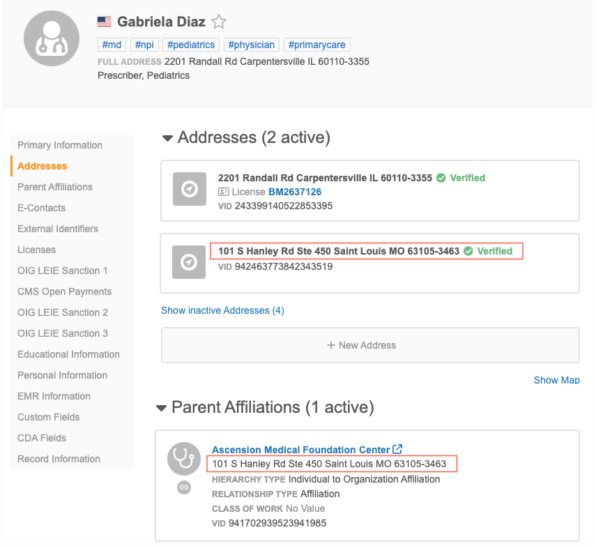 To simplify address management, new or existing parent HCOs can now be linked to existing addresses on records if the addresses match. This ensures that any changes to the parent HCO's address are also made to the child HCO or HCP's.
