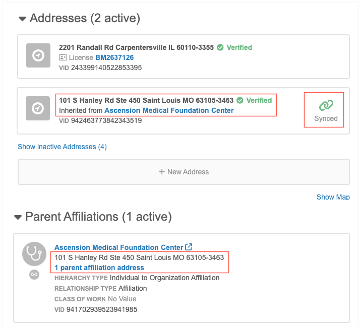 On the record profile, the existing address is updated to display the Parent HCO that the address in inherited from. The Synced icon displays to indicate that the address is linked to a parent HCO.