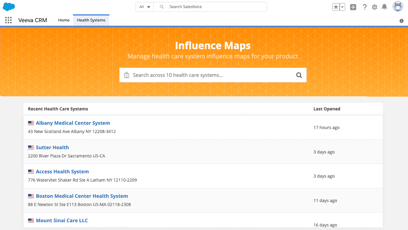 <apex:page standardController="Account"> <!-- Include the script to load widget --> <script type="text/javascript" src="https://sandboxwidgets.veevanetwork.com/veeva-network-manifest.js"></script> <script type="text/javascript" src="https://sandboxwidgets.veevanetwork.com/veeva-network-affiliation-widget-loader.js"></script> <!-- These are the styles for the visualforce page. Put them in a custom-style to ensure no styles leak to the widget --> <custom-style> <style> html, html body.sfdcBody { height: 100%; padding: 0; margin: 0; box-sizing: border-box; border: 0; } html body.sfdcBody { background-image: url('https://na73.lightning.force.com/_slds/images/themes/oneSalesforce/banner-brand-default.png?cache=210.2'), linear-gradient(to top, rgba(32, 92, 159, 0), rgb(32, 92, 159)); background-repeat: repeat; background-position: top left; padding: 0.02rem 0.02rem 0; } .container { height: 100%; box-sizing: border-box; border-top: 1px solid #333; border-top-left-radius: 0.25rem; border-top-right-radius: 0.25rem; margin: 0 auto; } .oRight .container { border: 1px solid #333; border-radius: 0.25rem; } #widgetEl { width: 100%; height: 100%; margin: 0; padding: 0; } </style> </custom-style> <!-- Add the affiliation widget --> <div class="container"> <veeva-network-affiliation-widget id="widgetEl" auth-domain="verteo.veevanetwork.com" widget-name="AffiliationWidgetName" widget-id="NTE0Ozs7aGVhbHRoc3lzdGVtc19fYw=="></veeva-network-affiliation-widget> </div> </apex:page>Sample page for Salesforce Classic