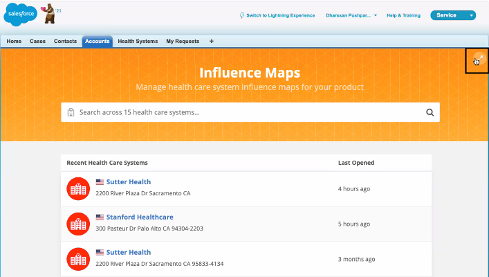 The Affiliation widget can be viewed in full screen when it is embedded in Salesforce Classicâ„¢. Use the Full screen icon in the top right corner to expand the Affiliation widget.