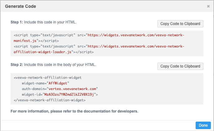 After administrators save the Affiliation widget configuration, Network generates the code snippets that are required for your web-based internal application.