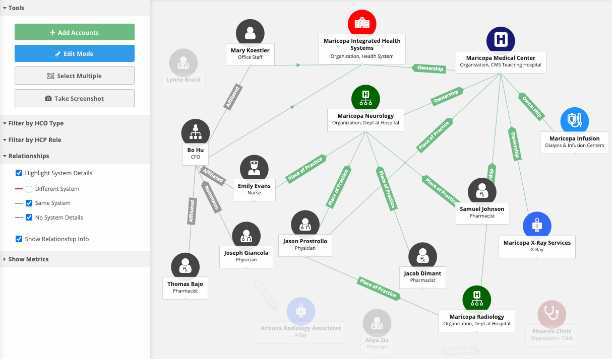 Highlight System Details - Highlight the connecting lines with color for HCP-HCO and HCO-HCO relationships that are in the same system but different locations to understand the patient journey.