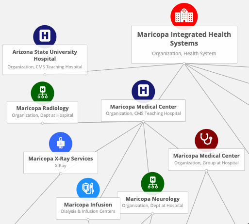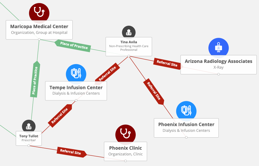 In this example, we've used branding to understand the patient flow within Maricopa Health System. Using labels and colors, we can see where patients are being referred to outside the health system.