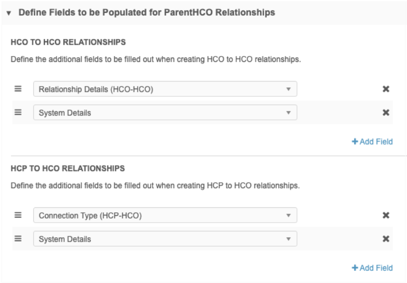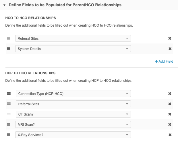 These fields are added to the Define Fields to be Populated for ParentHCO Relationships section in the widget configuration.