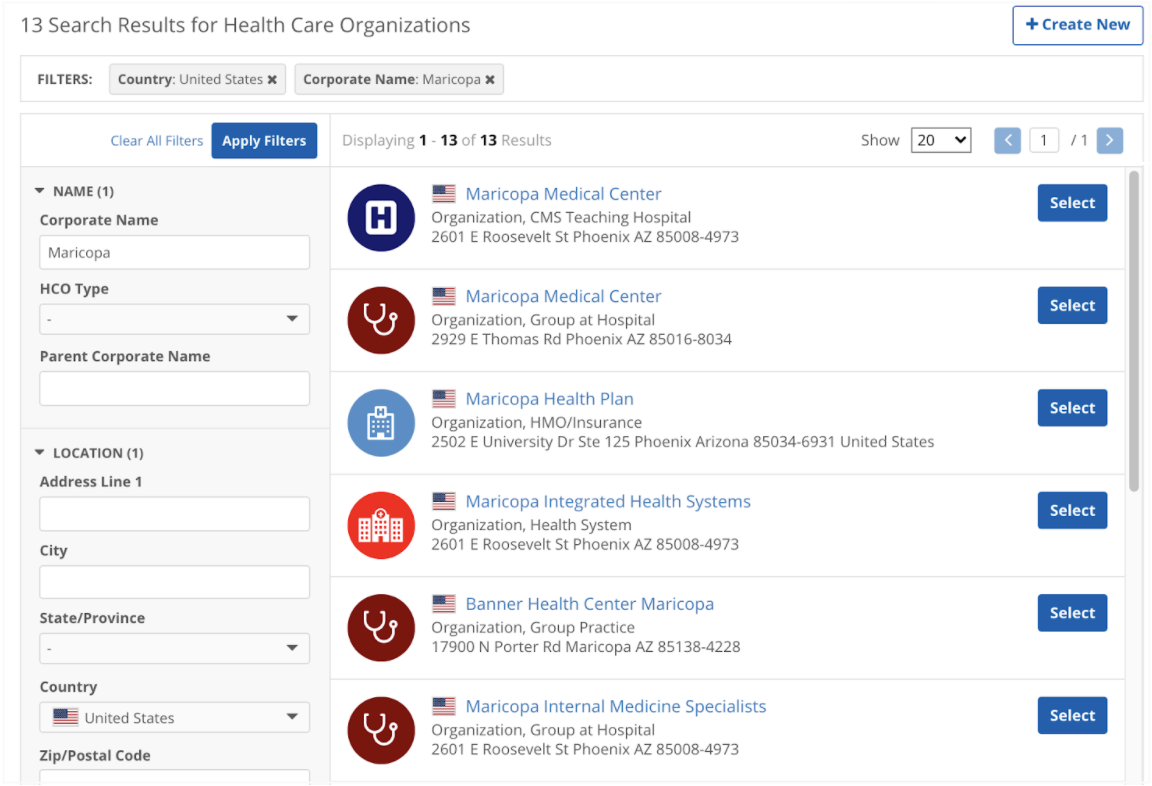 Using this mapping, HCOs with the reference values defined in the hco_type__v field use the mapped color and icon defined. If a reference value isn't mapped for custom branding, the default HCO icon mappings are used.