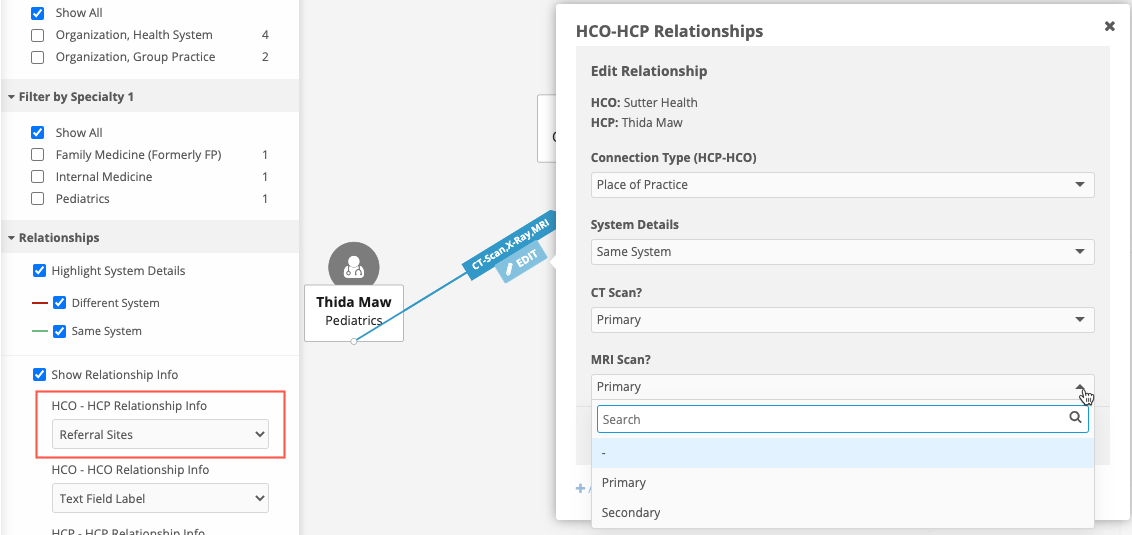 In this example, if a parent HCO is Referral Site relationship using the hcp_hco_connection_type__c field, it can be identified as being in the Same System or Different System on the Influence Map using the system_difference__c field.