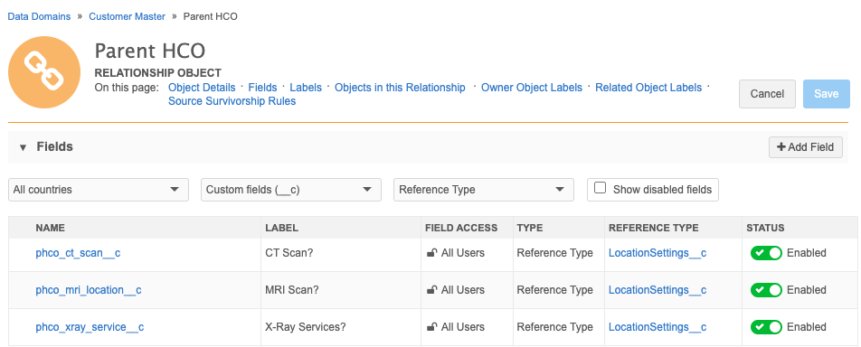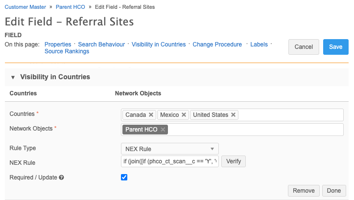 In this example, we'll concatenate multiple referral site fields together on the parentHCO object label for HCO-HCP relationships.