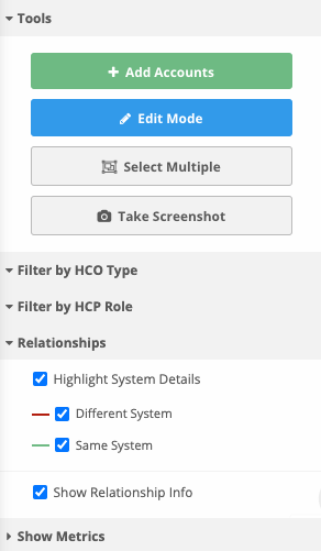 Show Relationship Info - Choose to display labels and arrows on the connecting lines that represent parent HCO relationships.