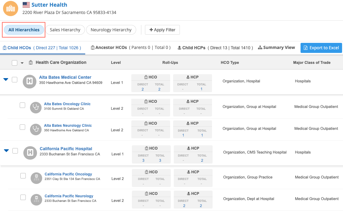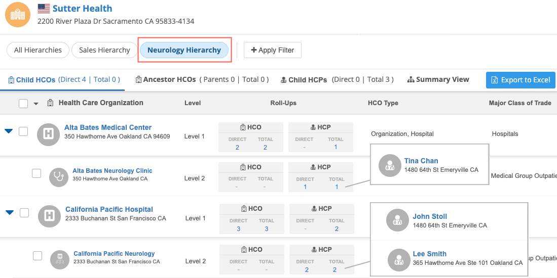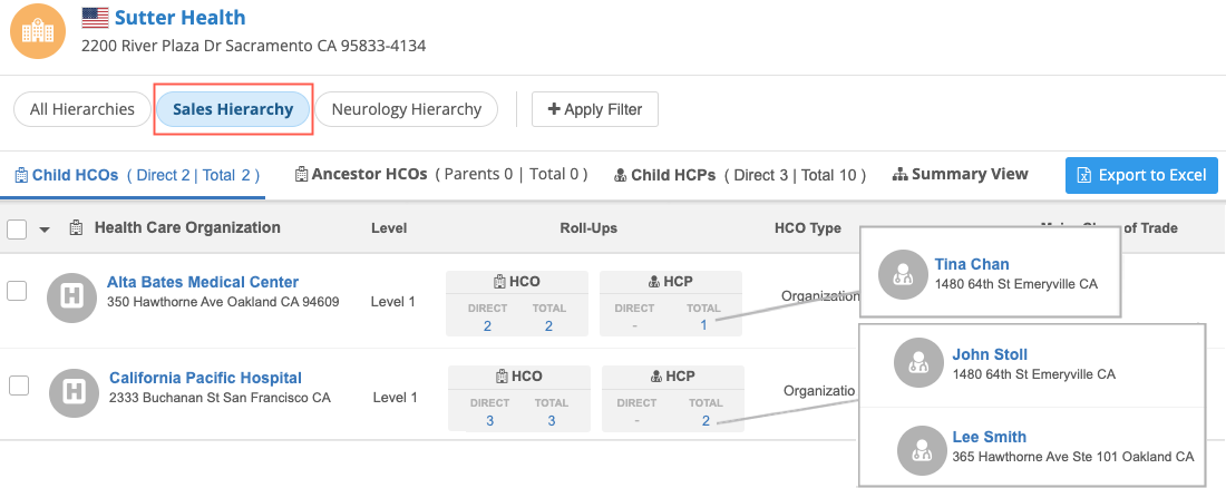In this simplified example, the Sutter Health health system includes two hospitals. Each hospital contains some clinics or departments and there are HCPs that roll up to them.