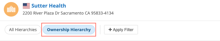 The Ownership hierarchy filters the parenthco relationships so only Ownership and Affiliation relationship types display in the hierarchy. Relationships of other types; for example, Business Partner/Affiliate, CMS Hospital Claims, GPO, and so on, are removed so you can focus on the HCOs and HCPs directly involved in therapeutic health care practices. The filter is applied to every level in the hierarchy.