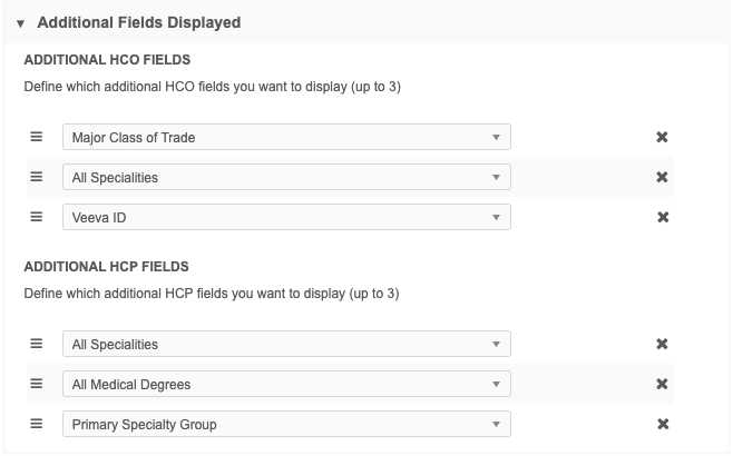 Choose fields to display for HCOs and HCPs. These fields display as columns in the Hierarchy Explorer and users can filter the results using these fields. They will also be exported if users export data from the Hierarchy Explorer.