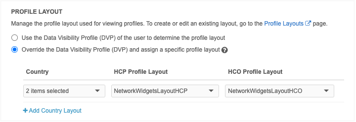 If you choose this option, define the Country and profile layouts for HCPs and HCOs.
