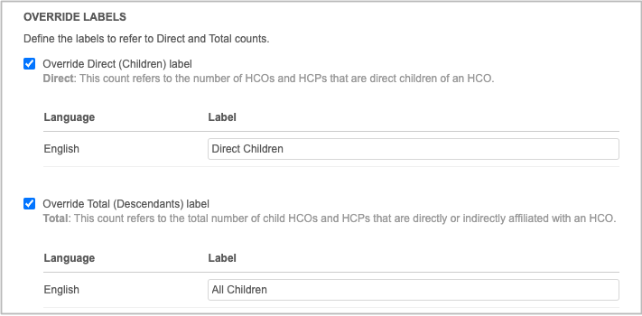 Override Labels - Define labels to replace the Direct and Total counts that display on the Child HCOs and Child HCPs tabs and in the Roll-Ups section for each HCO and HCP listed.