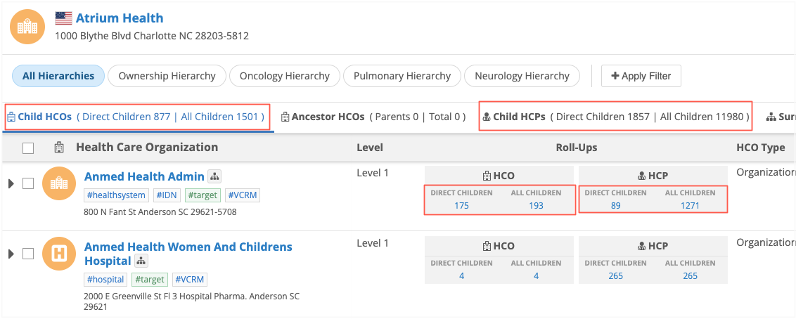 To ensure that users understand that the counts refer only to child HCOs and HCPs, you can change the labels to Direct Children and All Children.