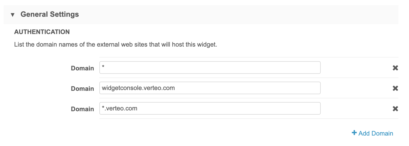 Note: If developers are implementing the widgets using a local host server, add an asterisk (*) to the domain list in the widget.