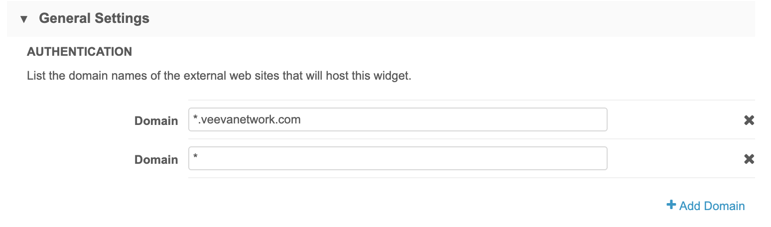 Network Portal - If you are embedding the widget into the Network portal, use *.veevanetwork.com or your instance URL; for example, verteo.veevanetwork.com.