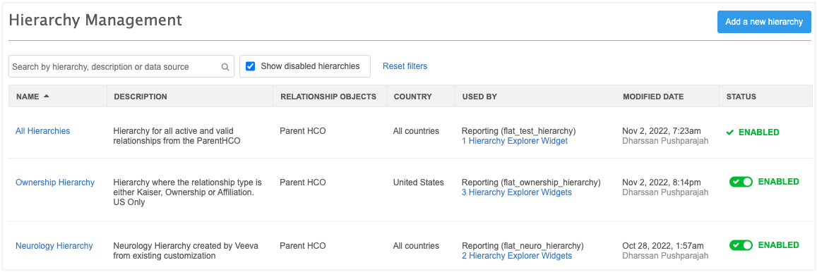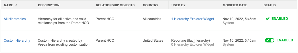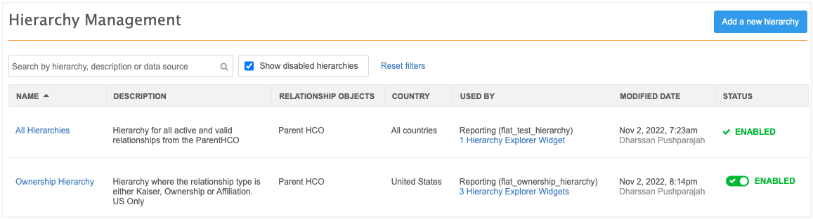 Modified Date - The date that the hierarchy was last modified and the user that made the change. Any hierarchies that were created by the Network team, will display System until a Network user makes changes.