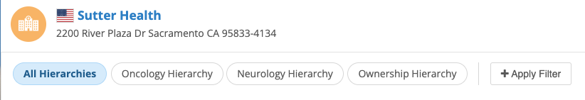 Hierarchy views display if the country defined in the configuration applies to the primary country of the root HCO. For example, the Ownership Hierarchy view applies to the US only, so it does not display for a health system in Canada.