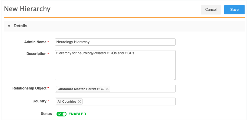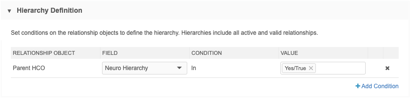 Hierarchy Definition section - Create conditions on the relationship object to define the hierarchy. If no conditions are created, the hierarchy will include all active and valid relationships by default.