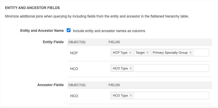 Entity and Ancestor Name - Select this option to define additional fields to include in the reporting table.
