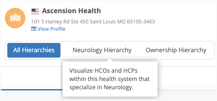 For a neurology-related hierarchy, you might have a custom field on the ParentHCO object to flag HCOs that specialize in neurology.