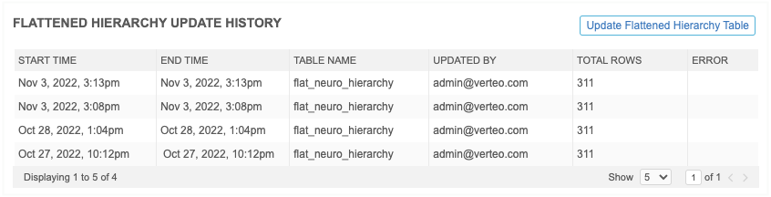 Flattened hierarchy update history - This section displays after the hierarchy is saved and the flattened hierarchy table data is updated for the first time. It identifies the date and time, the user that triggered the update and the total rows of data in the table. Any errors that occur will also display.