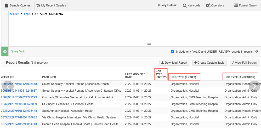 All hierarchies (flat_hierarchy) - Includes all active and valid HCPs and HCOs for the ParentHCO relationship object.