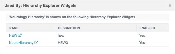Hierarchy Explorer widgets - A count of widgets that use the hierarchy. Click the link to view a list of the widgets.