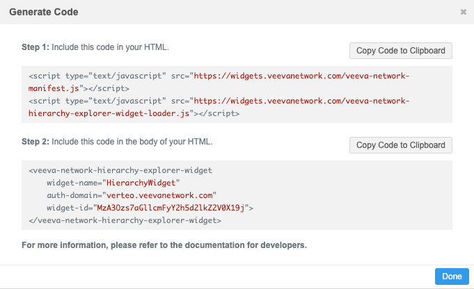After administrators save the Hierarchy Explorer widget configuration, Network generates the code snippets that are required for your web-based internal application. Click Generate Code to copy the code so you can provide it to your web developer.