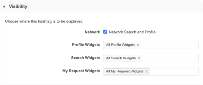 Click the Hashtags link to go to the Network Hashtags configuration. You can open a hashtag and go to the Visibility section to define the hashtag settings for this widget.