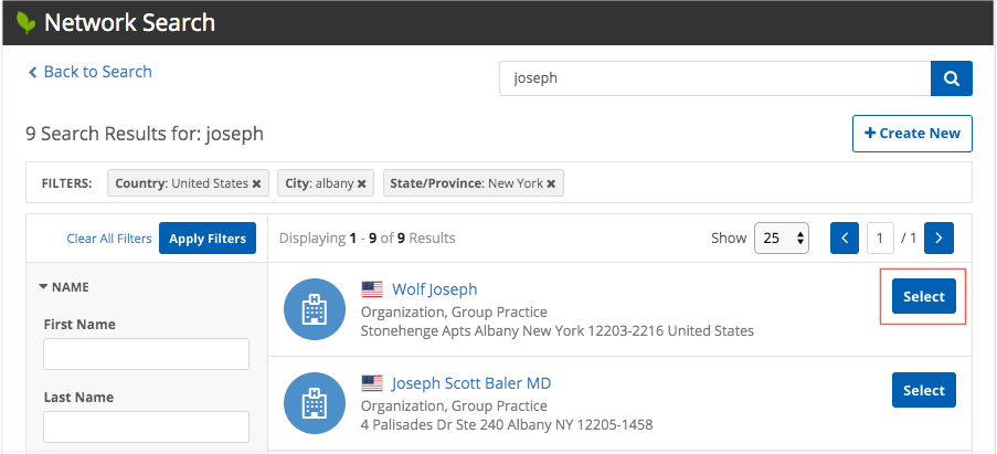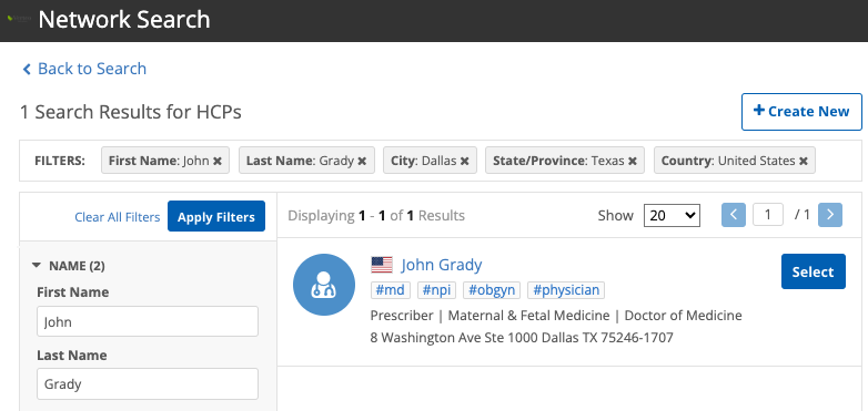Web developers can define a select event to trigger when users click the button beside the search result. When the event triggers, a JSON returns the primary information for the selected record (HCP or HCO); for example, name, Network entity ID (VID), addresses, licenses, parent HCOs, alternate keys, and custom keys. Web developers can customize the JSON so that the record can be added to your downstream system.