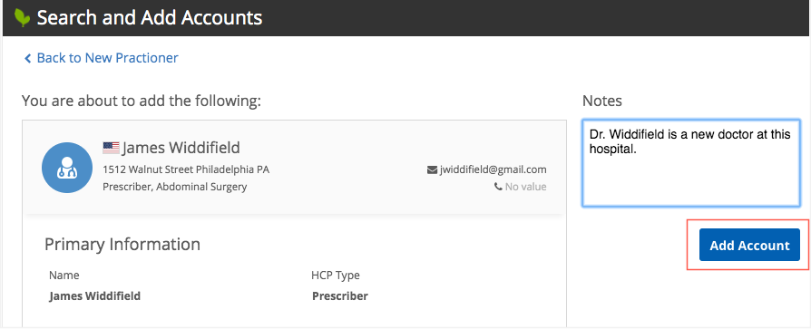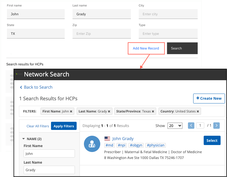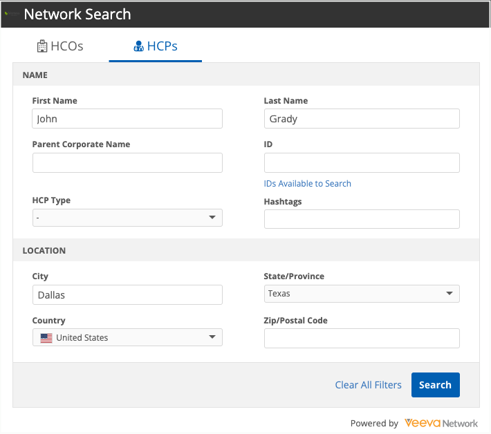 In this example, the search widget is embedded in an internal application. After a user searches locally for an HCP, they can launch the Search widget to search Network and OpenData for that HCP. The Search widget is configured to prefill the search form and automatically search for the terms that the user already entered in their internal app.