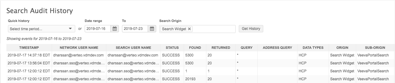Search Audit History - Tracks searches in the search widget. Use the Search Origin list to specify the Search Widget.