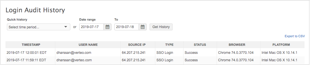 Identify widget activity using the Type column. Any SSO Login entries identify log in activities for widgets.