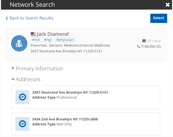 Jack Diamond has two addresses: one Professional address and one Mail Only address.