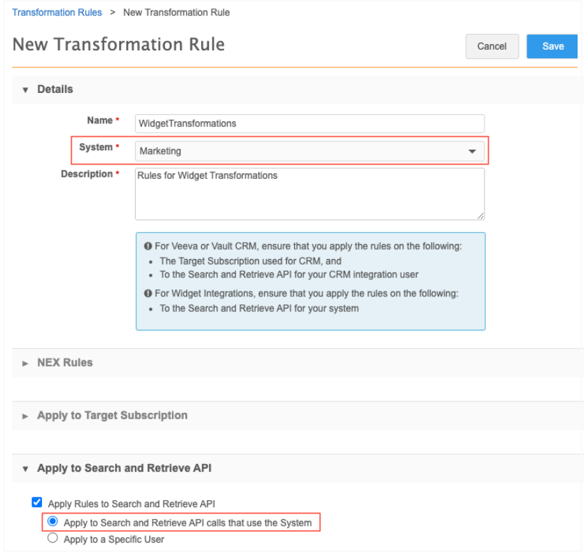 On the transformation rule configuration, you can apply rules to the Search and Retrieve API calls that use the defined system.
