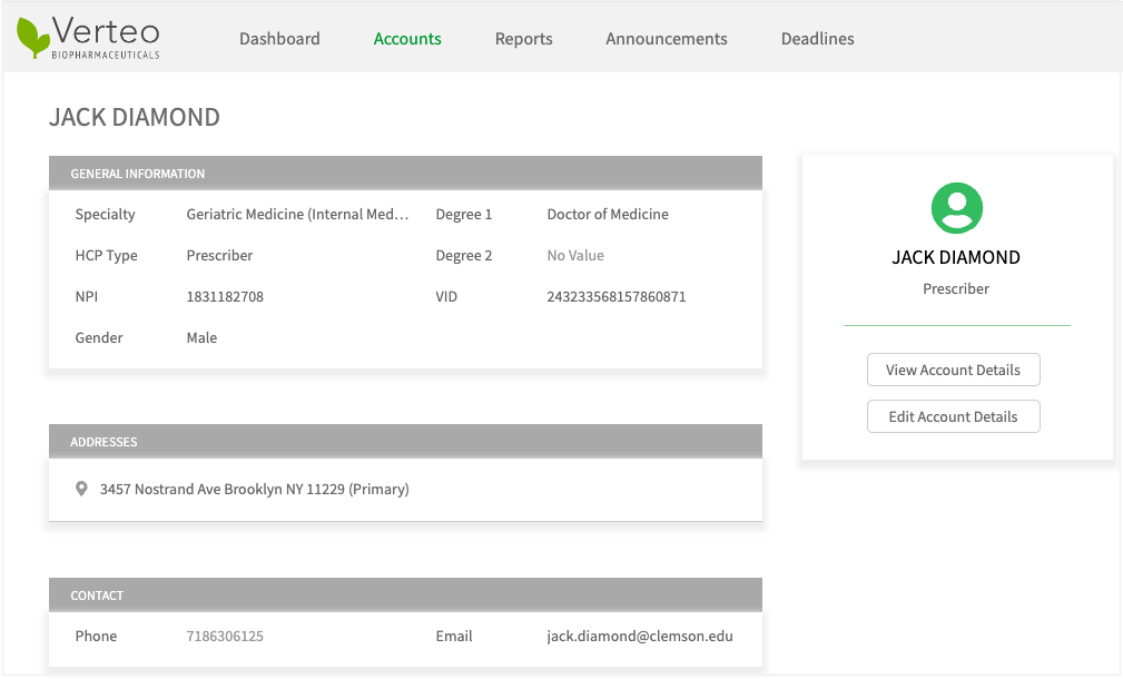 A user searches for an HCP account, Jack Diamond, in the Search widget.
