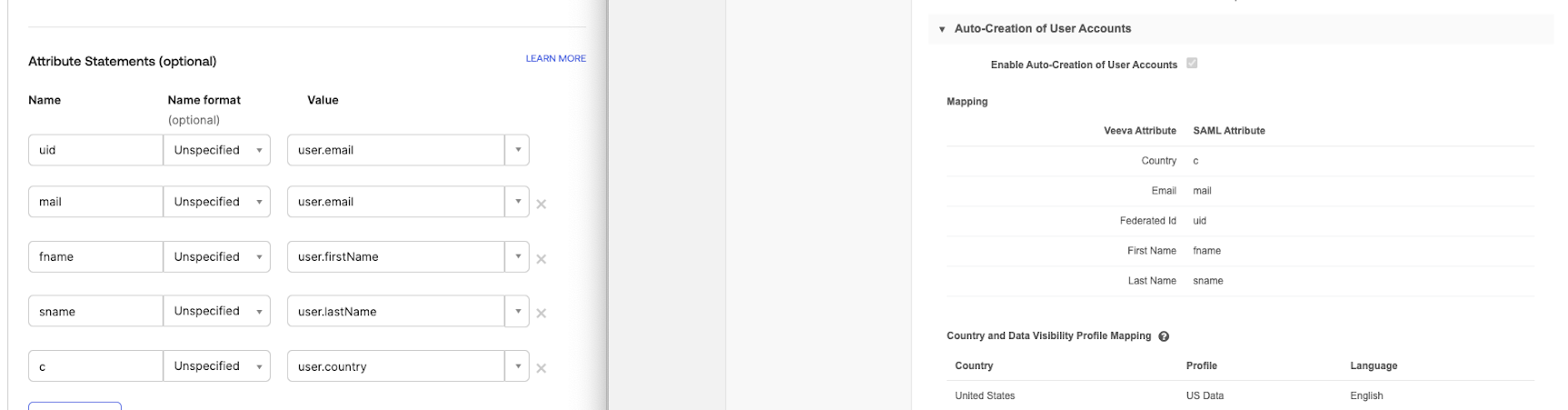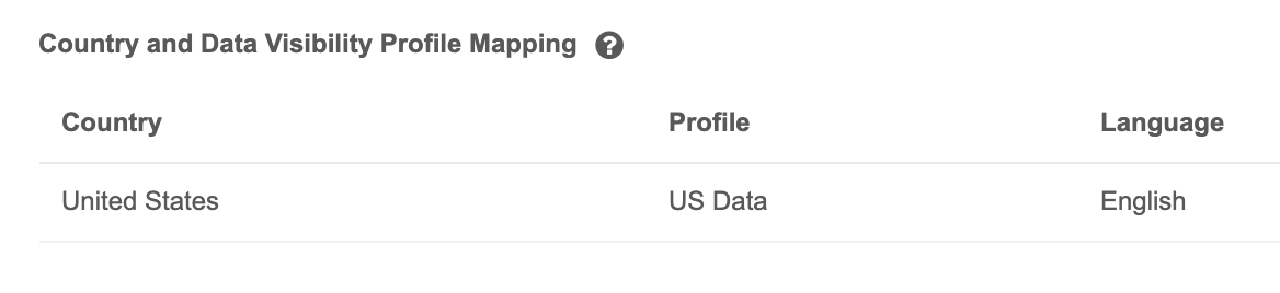 The country attribute passed by the single sign-on settings maps to the country specified in the Country and Data Visibility Profile Mapping section. A country must be provided for the configuration to work properly.
