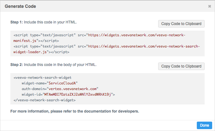 More information, along with code samples, is available on the Veeva Network developer site at https://developer.veevanetwork.com/widgets/.