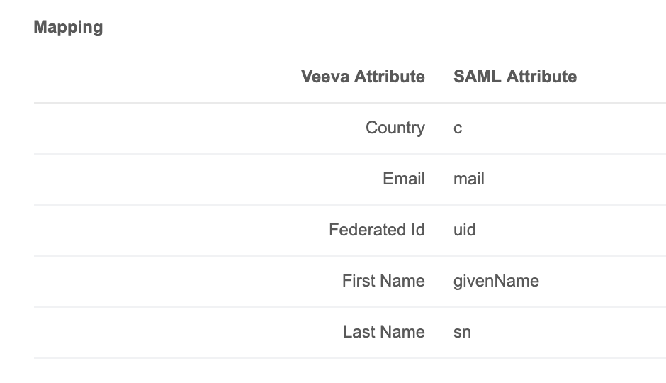 The Mapping section of the Single Sign-On Settings page enables you to map SAML attributes to the corresponding Veeva attributes. The fields specified here must match those specified when you configured the Network application on your identity provider's site. All values except mail are required.