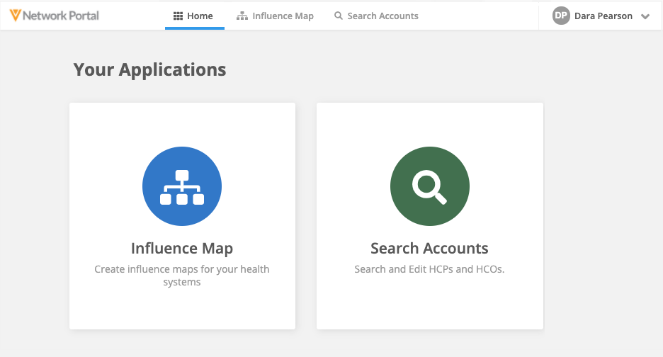 The Network Portal includes a predefined search application, Search Accounts, so users can find and edit HCP and HCO accounts in Veeva OpenData and your Network instance.