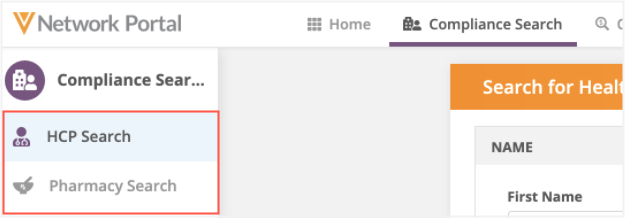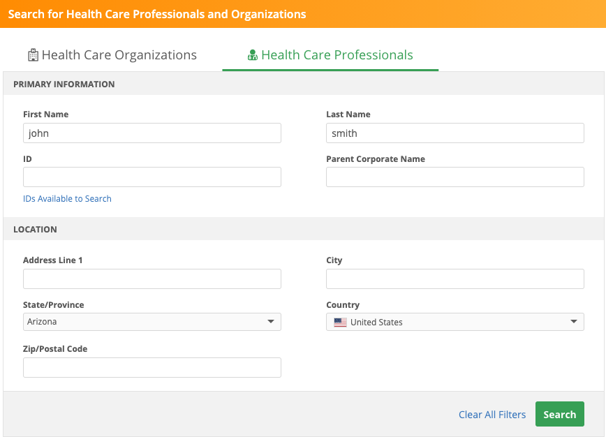 Use the widget to search for HCP and HCO accounts. Click the Health Care Organizations and Health Care Professionals tabs at the top of the application to toggle between the two search forms.