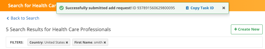 When you submit the request, a confirmation message displays and includes the VID of the new account. Click Copy Task ID if you want to store your request somewhere locally for reference. Click the x icon to remove the message.