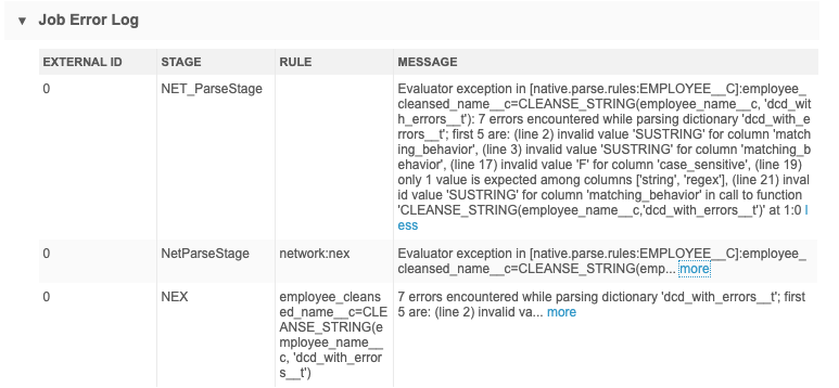 When the data cleansing function is called and an error occurs, the errors display in the Job Error Log section on the Job Details page. The first five errors display.