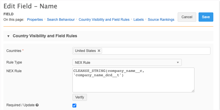 Data model field - Expand the Country Visibility and Field Rules section and add the NEX rule.