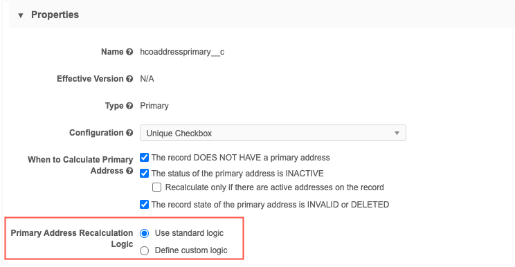 Note: The custom recalculation logic runs when the existing primary address defined on a record becomes disqualified.